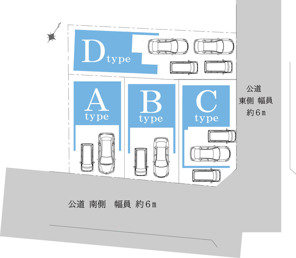 | 販売価格 | A棟:5,390万円 B棟:5,390万円 C棟:5,590万円 D棟:5,550万円(土地+建物+税込) | 土地面積 | A棟:70.00㎡(21.17坪) B棟:69.92㎡(21.15坪)C棟:74.65㎡(22.58坪) D棟:103.27㎡(31.23坪) |